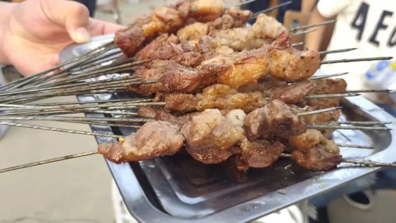 烤肉滋滋發(fā)出聲響,一滴熱油順著飽滿的肉的紋路慢慢滑下,令人心醉。細(xì)細(xì)的嗅,慢慢的聞,饞得直咽口水。
